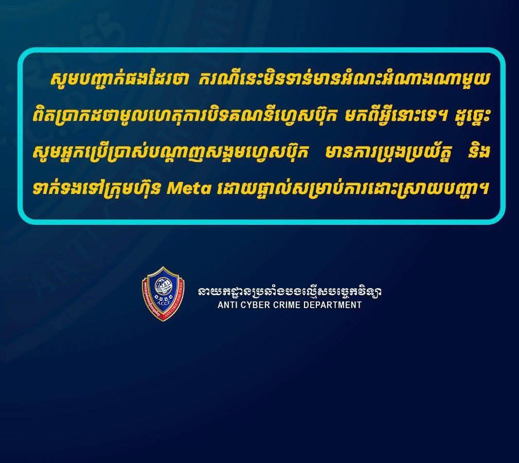 នាយកដ្ឋានប្រឆាំងបទល្មើសបច្ចេកវិទ្យា សូមក្រើនរំលឹក និងជូនដំណឹងដល់អ្នកប្រើប្រាស់បណ្ដាញសង្គមហ្វេសប៊ុក ដែលគណនីត្រូវបានបិទ (Disable) ដូចតទៅ៖